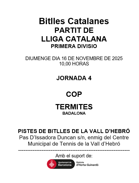 El diumenge dia 16 de novembre a les 10 hores en el camp de Bitlles de la Vall Hebron es disputara el partit de Bitlles de La Lliga Catalana de Bitlles de Primera Divisió entre els equips COP-Termitas de Badalona